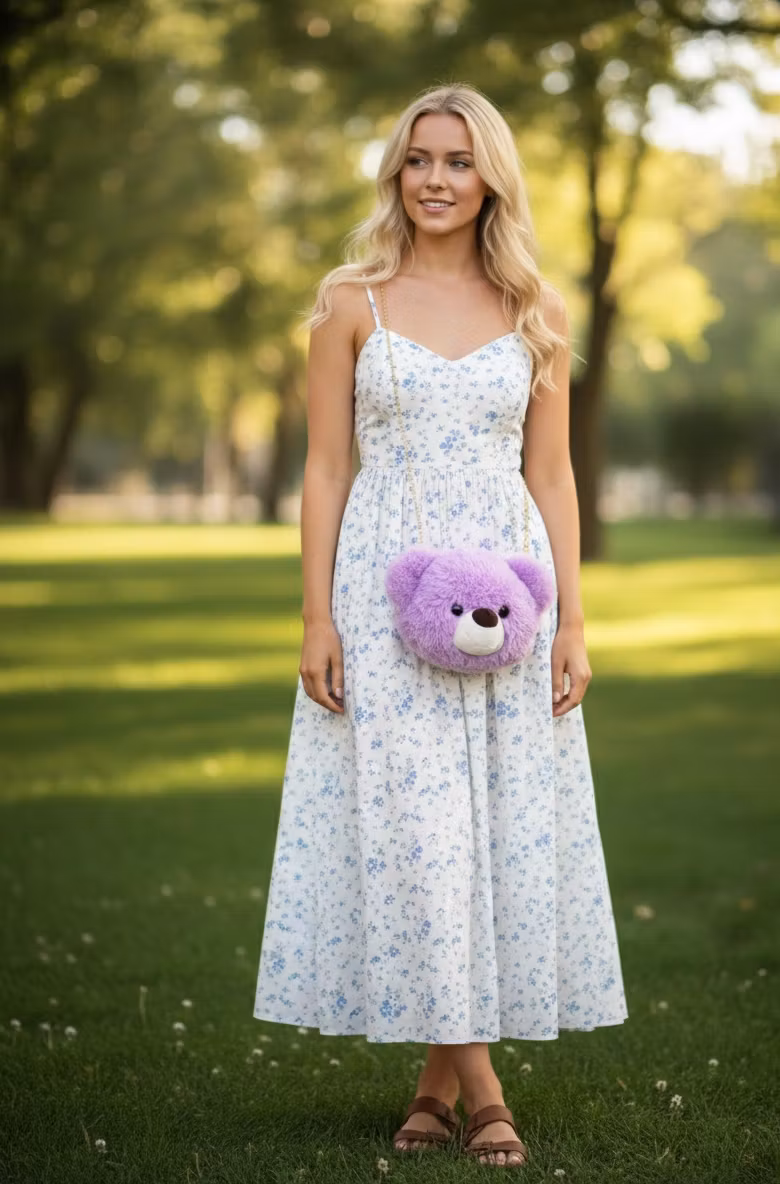 Möt din nya favoritaccessoar! Denna bedårande axelremsväska är formad som ett sött björnhuvud i en fantastisk pastellila nyans. Den är tillverkad av högkvalitativ, mjuk fuskpäls som är lika skön att röra vid som den är snygg att se på.
