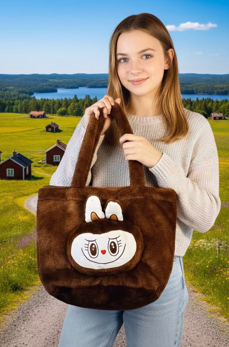 Är du ett fan av den populära monster-kaninen? Nu kan du bära med dig Labubu överallt! Denna bruna plyschväska är inspirerad av den ikoniska karaktären med sina busiga tänder och det lilla röda hjärtat på näsan. En perfekt väska för dig som älskar "Art Toys" och vill ha en unik stil.
