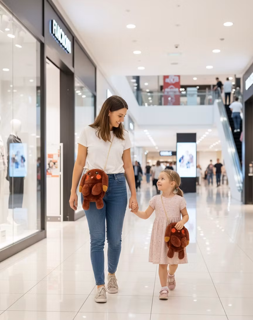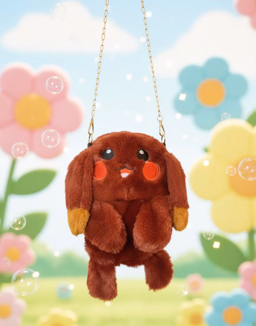 Denna unika väska är mer än bara en accessoar – det är en trogen följeslagare i en förtrollande chokladbrun nyans. Med sina stora, snälla ögon, rosa kinder och de hängande öronen med ljusare detaljer, påminner den om en karaktär direkt ur en sagovärld.