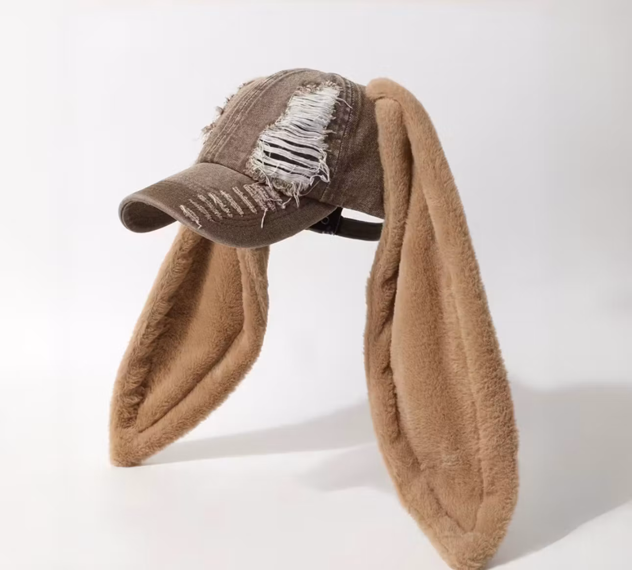De lÄnga öronen hÀnger elegant ner pÄ sidorna och Àr gjorda av ett lyxigt, mjukt fuskpÀlsmaterial som du bara vill ta pÄ. Kepsen har alla de klassiska detaljerna med en böjd skÀrm och en justerbar rem bak med metallspÀnne, vilket sÀkerstÀller en bekvÀm och perfekt passform för de flesta storlekar. Slitningen pÄ denimtyget ger kepsen en modern, "cool" kÀnsla, medan kaninöronen bidrar med en oemotstÄndlig charm.
