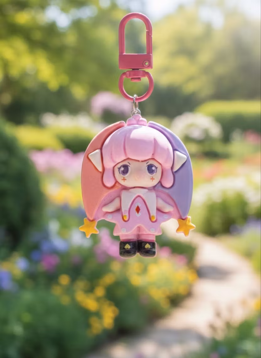 Den här söta nyckelringen föreställer en karaktär i pastellfärger med ett lekfullt uttryck. Med sin rosa och lila luva, små stjärnor och glittriga ögon sprider den en känsla av magi och fantasi.