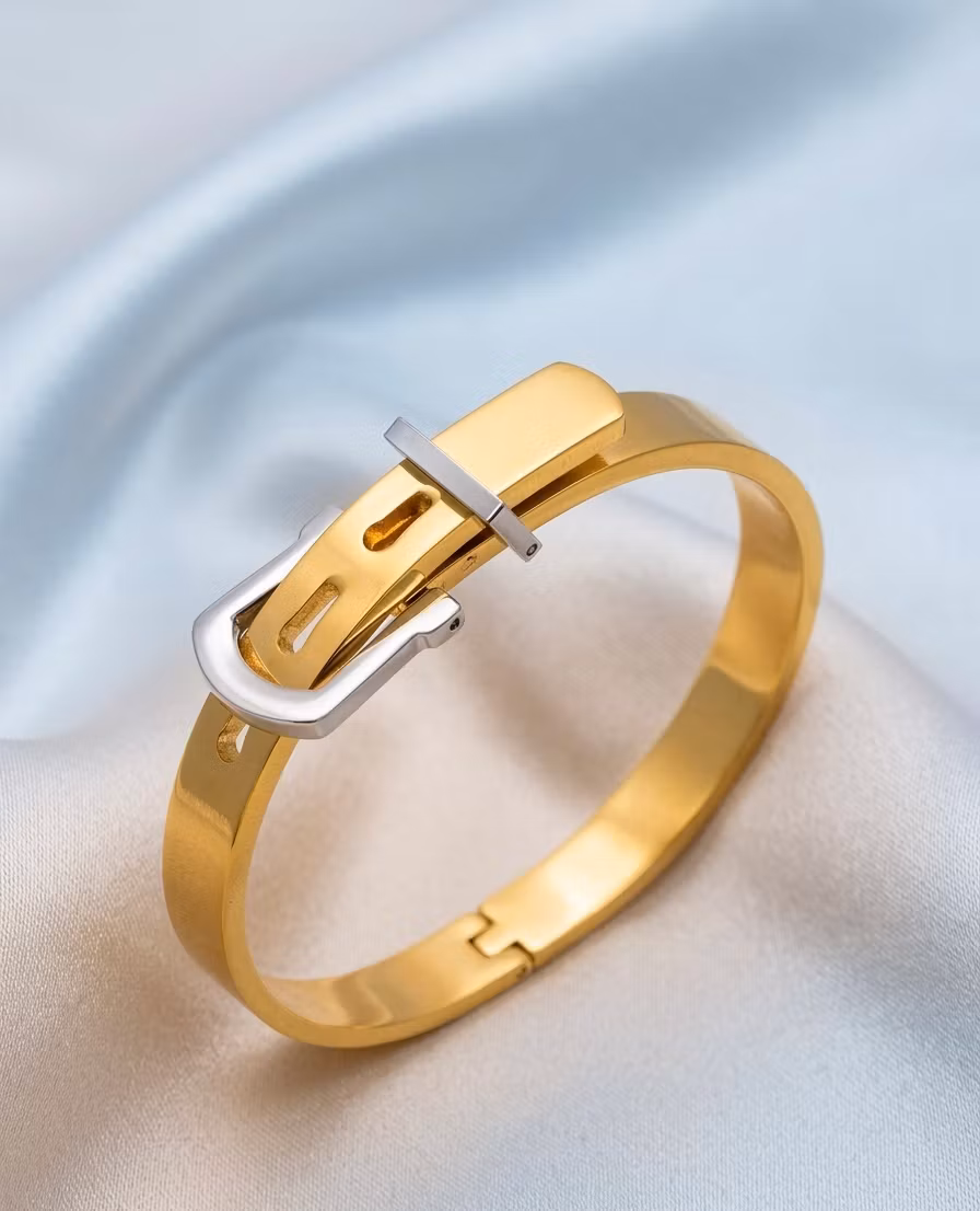 Uppgradera din smyckessamling med detta sofistikerade armband i en trendig bältesdesign. Armbandet kombinerar en vacker guldfärgad yta med detaljer i silver, vilket skapar en stilren tvåtonseffekt som passar till alla tillfällen – oavsett om det är till vardagslooken eller festklänningen.