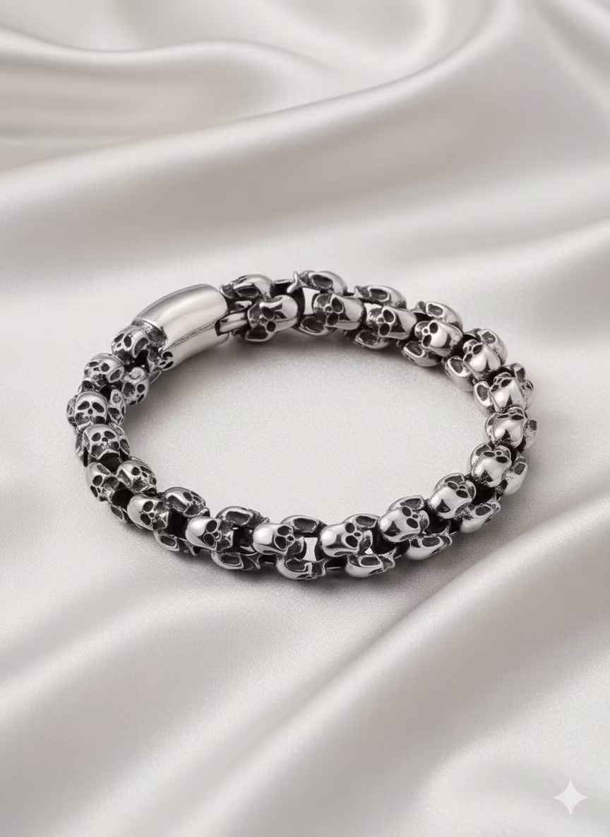 Uppgradera din smyckessamling med vårt exklusiva dödskallearmband, skapat för dig som älskar en unik och personlig stil. Armbandet är tillverkat av högkvalitativt rostfritt stål (rostfritt stål), vilket gör det både hållbart och skonsamt mot huden. Materialet behåller sin lyster över tid utan att mörkna, så du kan bära det varje dag med självförtroende.