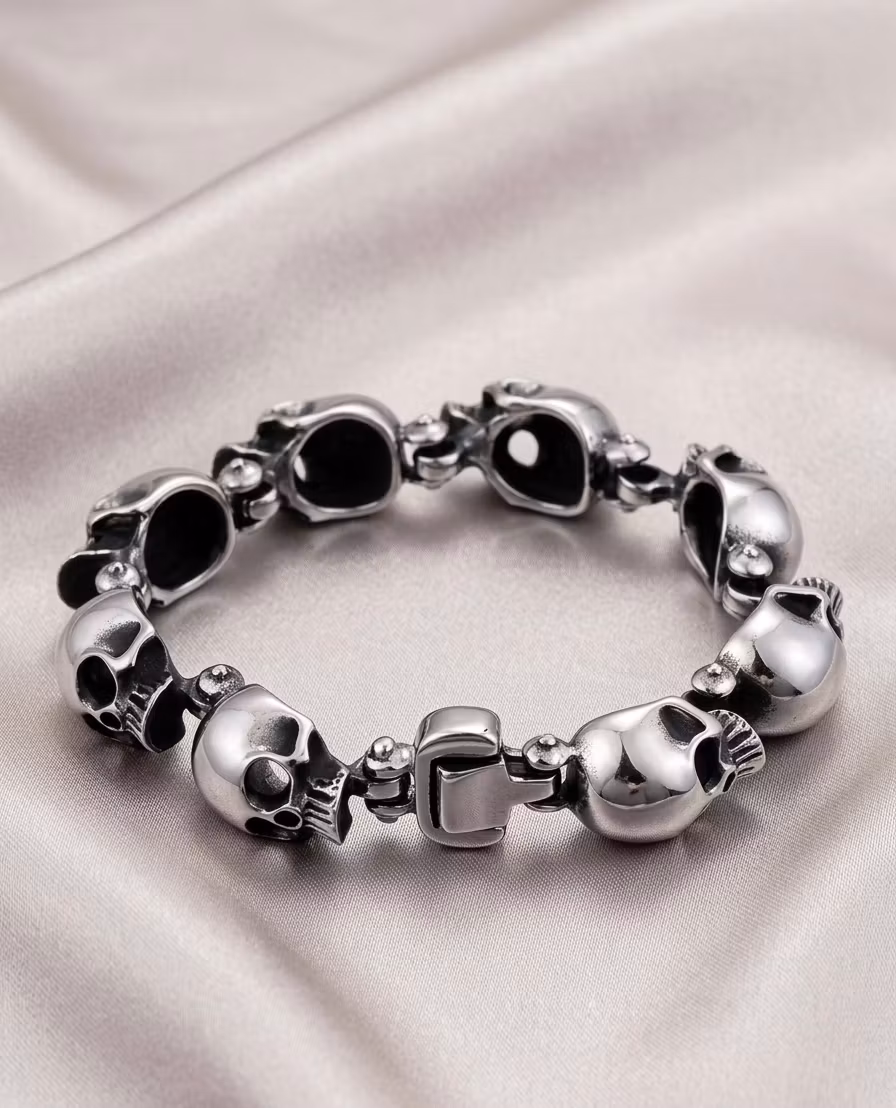 Det hÀr armbandet kombinerar en rÄ, rockig design med en lekfull kÀnsla. Varje lÀnk Àr omsorgsfullt utformad som en liten dödskalle med fina detaljer och en polerad finish som fÄngar ljuset snyggt. Trots sitt tuffa utseende kÀnns det mjukt mot huden och Àr bekvÀmt att bÀra hela dagen.