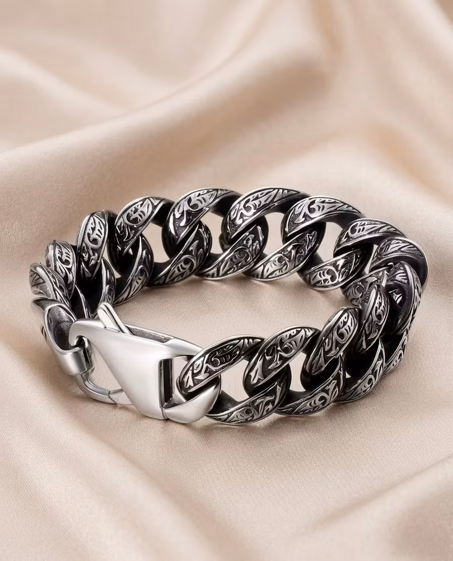 Varje länk är omsorgsfullt graverad med intrikata mönster som för tankarna till forntida runstenar och nordisk ornamentik. Det robusta och stilrena låset garanterar att armbandet sitter säkert på handleden, oavsett om du befinner dig ute på äventyr eller på en finmiddag. Detta är mer än bara ett smycke – det är en symbol för styrka och tidlös design.
