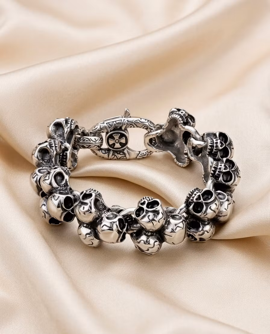 Uppgradera din smyckessamling med detta unika och detaljrika armband. Varje länk består av noggrant utformade dödskallar som skapar en iögonfallande 3D-effekt runt handleden. Armbandet har en robust konstruktion med ett säkert lås prydt med ett stilfullt korsemblem, vilket ger en extra dimension till designen.