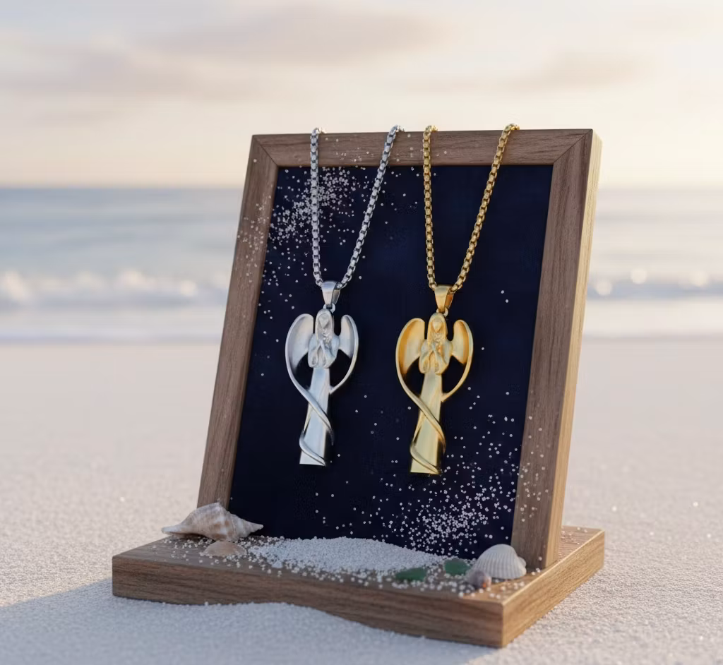 Ge din stil en himmelsk touch med vårt vackra hängsmycke föreställande en vaktängel. Denna eleganta design kombinerar ett modernt uttryck med en tidlös symbol för beskydd och hopp. Ängeln har en mjukt skulpterad form med vingar som omfamnar figuren, vilket ger en känsla av lugn och harmoni.