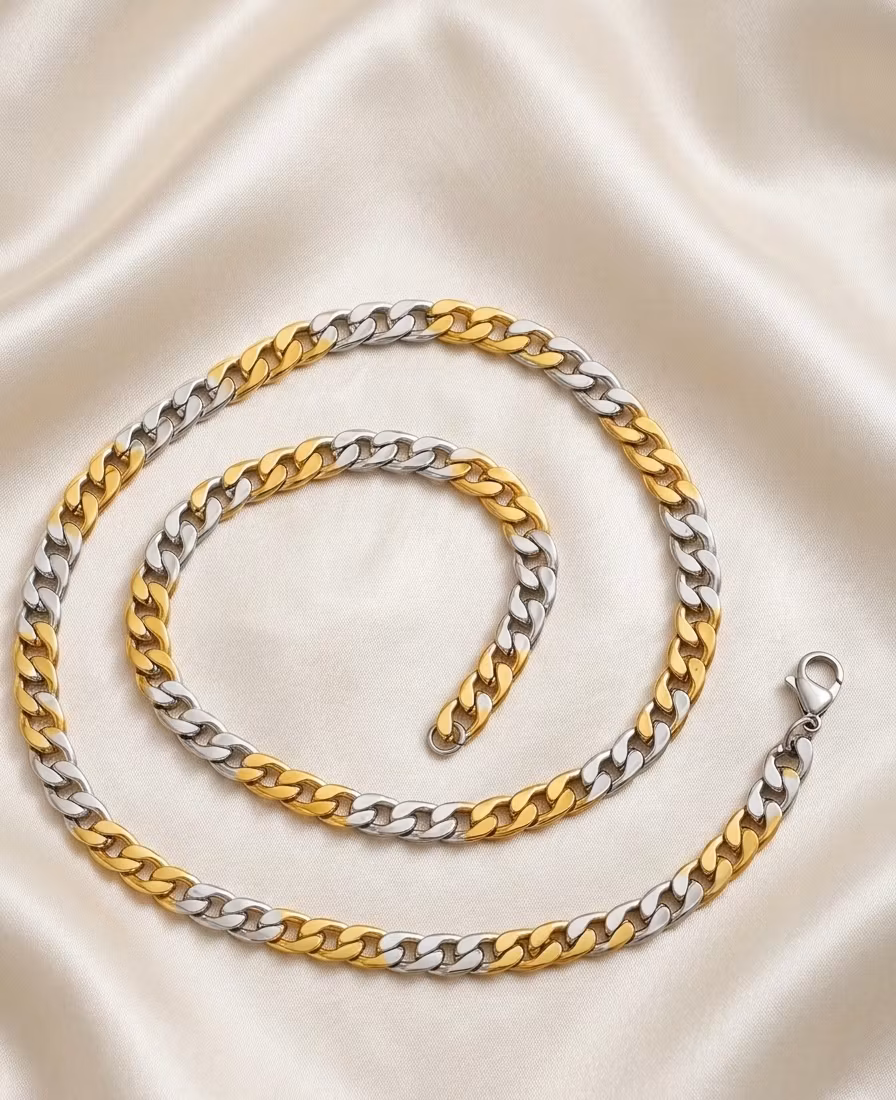 Det här halsbandet är skapat för dig som älskar att kombinera det bästa av två världar. Med en harmonisk blandning av guld- och silvertoner får du ett smycke som är både mångsidigt och iögonfallande. Den klassiska pansarlänken (Curb Chain) ger en lyxig känsla samtidigt som den är bekväm nog att bära hela dagen.