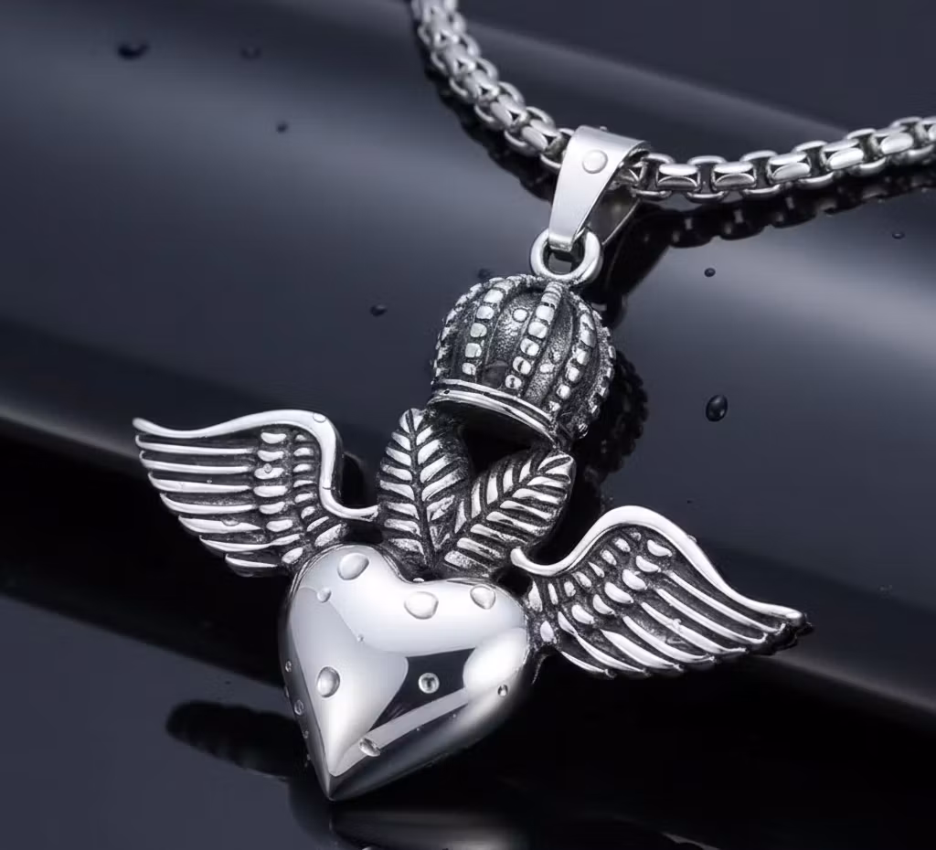 Upptäck den ultimata kombinationen av romantik och attityd. Det här unika smycket har en detaljrik design som föreställer ett hjärta prytt med vackra vingar och en elegant krona på toppen. Den oxiderade finishen ger smycket en vintage-look som verkligen framhäver de fina detaljerna i vingarna och kronan, medan själva hjärtat har en högblank yta som fångar ljuset perfekt.