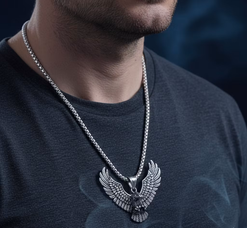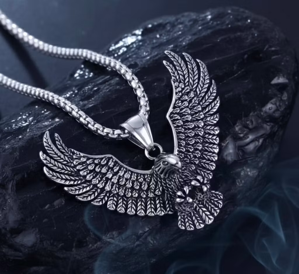 Halsbandet är tillverkat i rostfritt stål (stainless steel) av hög kvalitet, vilket gör det både hållbart och skonsamt mot huden. Materialet håller sin fina lyster länge utan att mörkna, så att du kan bära din örn varje dag, oavsett äventyr.