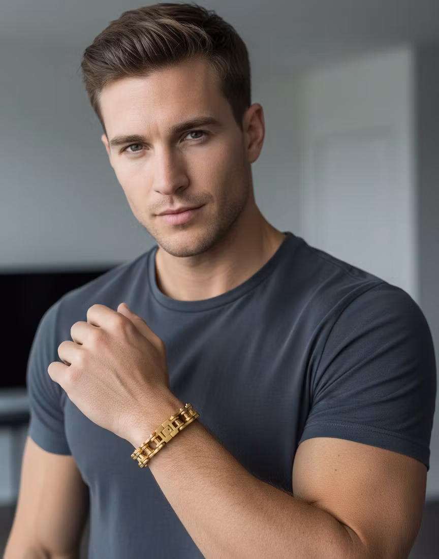 Upptäck den perfekta balansen mellan industriell design och elegant lyx. Vårt "Bicycle Chain Bracelet" är tillverkat i högkvalitativt rostfritt stål med en vacker finish i guld. Den robusta konstruktionen efterliknar en riktig cykelkedja, vilket ger en kraftfull men samtidigt sofistikerad känsla på handleden.
