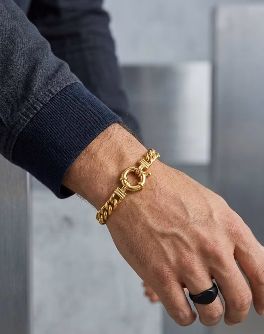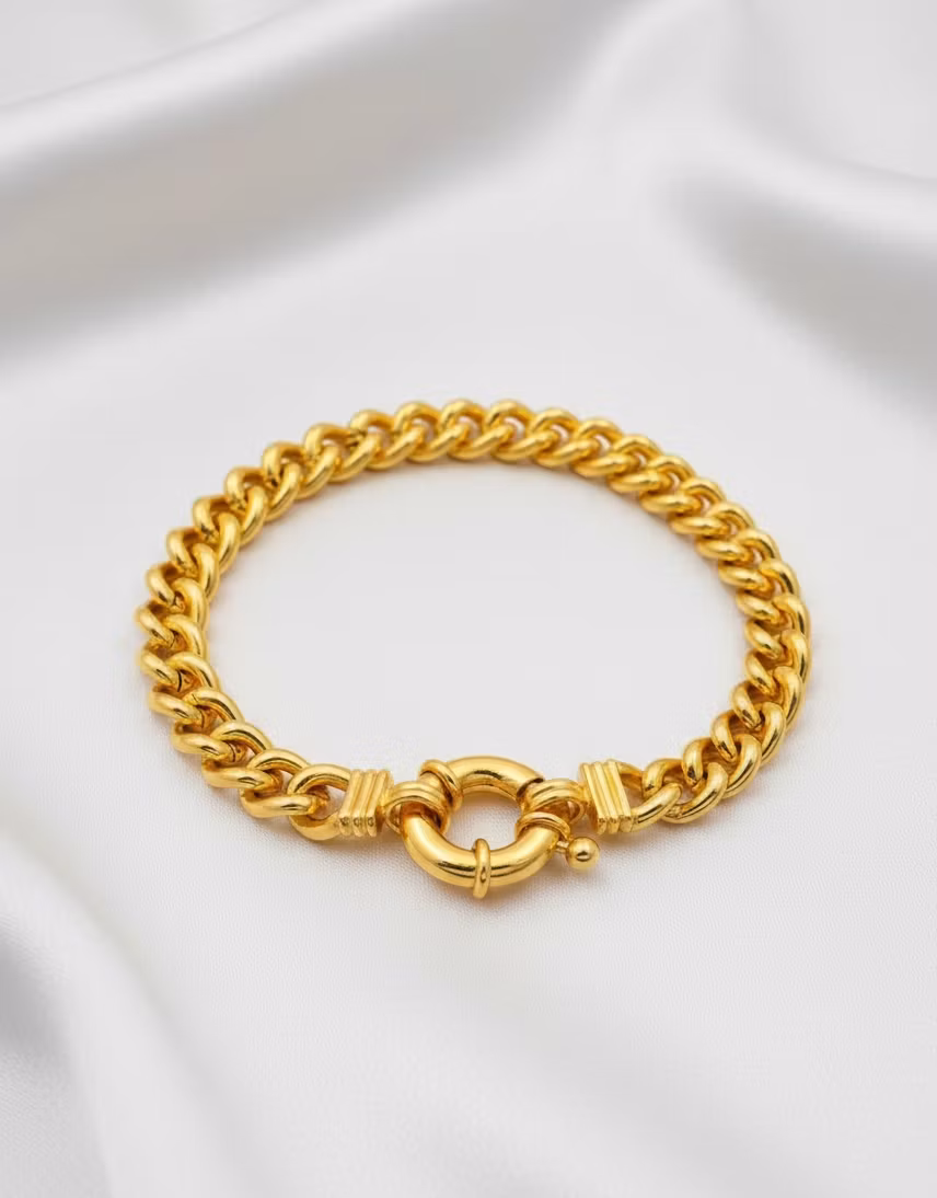 Uppgradera din smyckessamling med vårt eleganta kedjearmband i en vacker guldfärg. Armbandet har en tidlös curb-design som pryds av ett dekorativt och rejält fjäderlås, vilket gör det till en iögonfallande detalj på handleden.