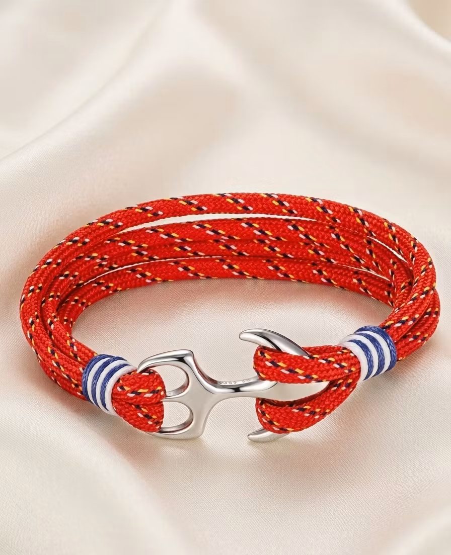 Armbandet är tillverkat av ett högkvalitativt, slitstarkt flätat rep i en livlig röd färg med kontrasterande detaljer, vilket gör att det sticker ut på handleden. Själva hjärtat i designen är det robusta ankaret som fungerar som ett säkert lås.