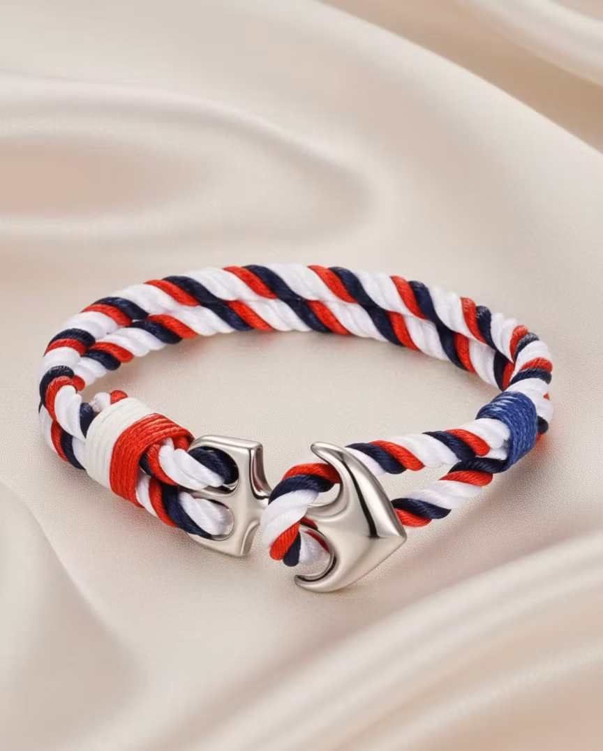 Detta eleganta armband är inspirerat av den klassiska marina stilen och kombinerar hållbarhet med en tidlös design. Den tvinnade snodden i färgerna rött, vitt och marinblått ger en fräsh och sportig look som passar lika bra till vardags som till festliga tillfällen på båten.