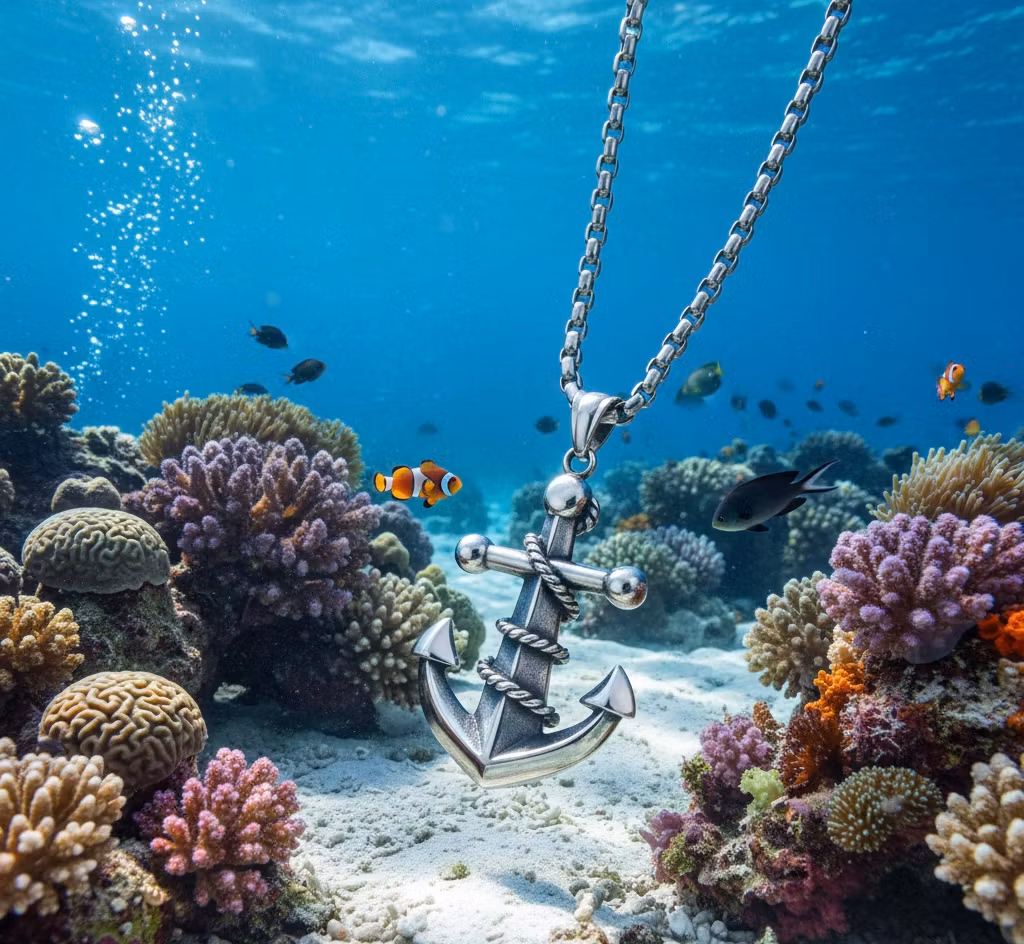 Detta tidlösa halsband är mer än bara en snygg accessoar; det är en symbol för stabilitet, styrka och hopp. Designen har ett vackert detaljerat ankare lindat med ett dekorativt rep, vilket ger en autentisk marin känsla med en rustik touch. Tack vare den oxiderade finishen framhävs detaljerna på ett sätt som ger smycket karaktär och djup.