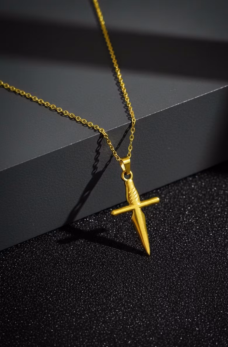 Ge din stil en vass kant med vårt eleganta dolk-halsband i guldfinish. Det här är det ultimata smycket för dig som söker något utöver det vanliga – en perfekt balans mellan minimalistisk design och en rebellisk känsla. Hänget är format som en klassisk dolk med fina detaljer och hänger vackert i en matchande tunn kedja.