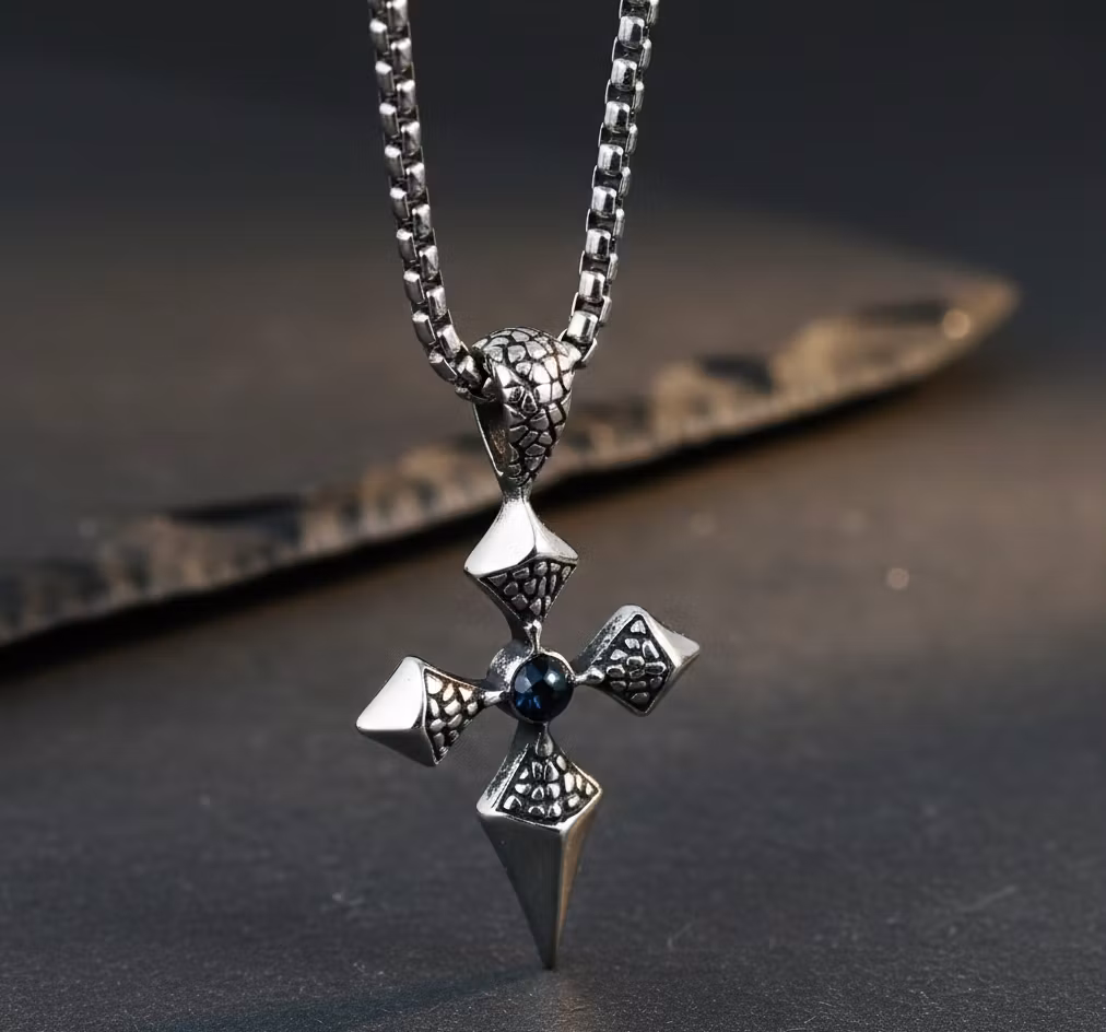 Upptäck kraften i vårt exklusiva korshalsband med drakfjällsmönster. Det här smycket kombinerar en rå, gotisk estetik med fina detaljer som verkligen sticker ut. Hänget är format som ett fyruddigt kors med en vacker, midnattsblå sten i mitten som fångar ljuset på ett mystiskt sätt.
