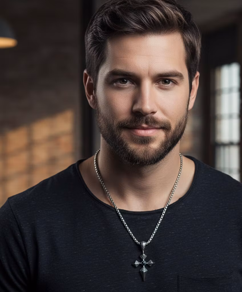 Halsbandet är tillverkat i högkvalitativt rostfritt stål, vilket gör det både hållbart och allergivänligt. Materialet behåller sin glans och mörka finish utan att färga av sig på huden eller kläderna. Den tillhörande boxkedjan ger en robust känsla och sitter bekvämt runt halsen hela dagen. Perfekt som present till dig själv eller någon som uppskattar smycken med karaktär.
