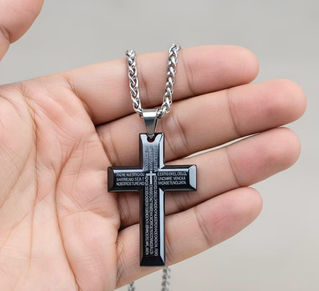 Ge din stil en djupare mening med detta eleganta herrhalsband. Det vackra hÀngformade korset i svart och silver Àr detaljerat graverat med bönen "Fader vÄr" (Padre Nuestro) pÄ spanska, vilket skapar en unik och fridfull kÀnsla.