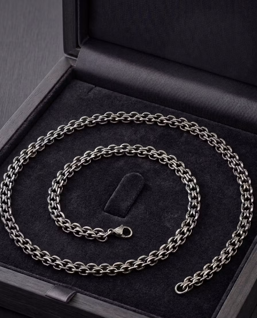 Tack vare materialet i rostfritt stål är kedjan både slitstark och allergivänlig, vilket gör den idealisk för daglig användning. Den mörka, råa finishen ger smycket en maskulin men sofistikerad karaktär som enkelt kan matchas med andra accessoarer eller bäras precis som den är för en minimalistisk look. Kedjan är utrustad med ett säkert klolås så att den sitter tryggt runt halsen hela dagen.