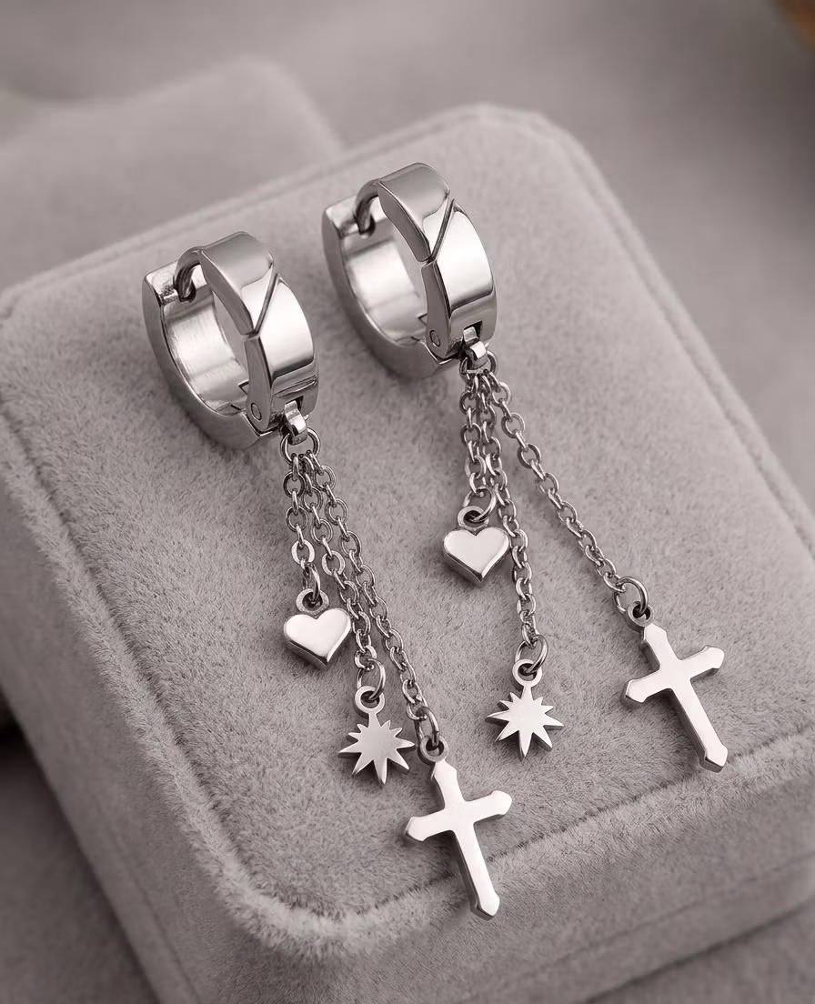 Det som gör dem speciella är de tre fina kedjorna i olika längder som pryds av tidlösa symboler: ett glänsande hjärta, en gnistrande stjärna och ett klassiskt kors. Designen skapar en dynamisk rörelse som fångar ljuset vackert varje gång du rör dig.