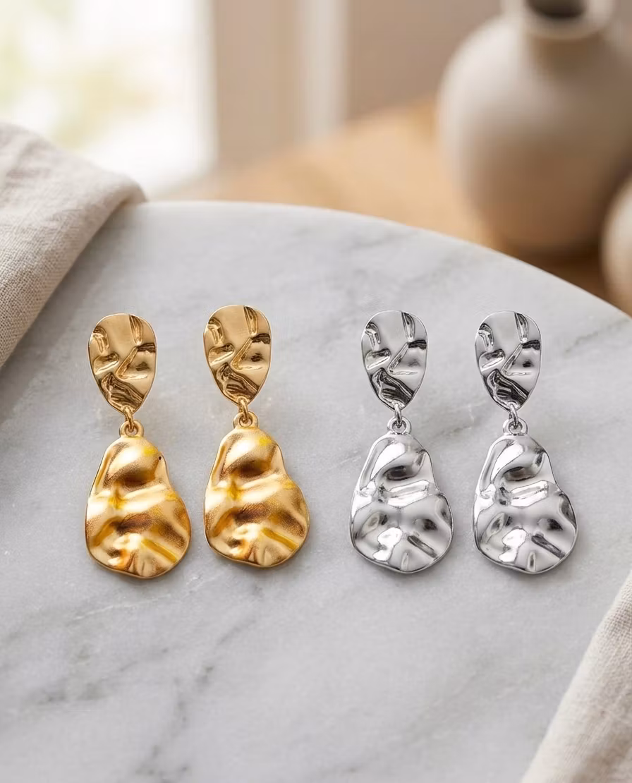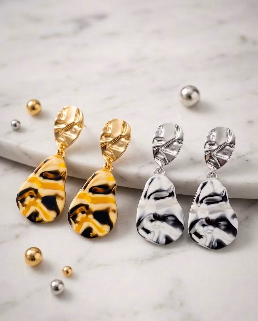 Upptäck den perfekta balansen mellan modern design och klassisk elegans. Våra örhängen har en unik droppformad design med ett iögonfallande marmorerat mönster som gör varje par helt unikt. Den hamrade metallplattan upptill ger en sofistikerad struktur och en lyxig känsla som fångar ljuset vackert.