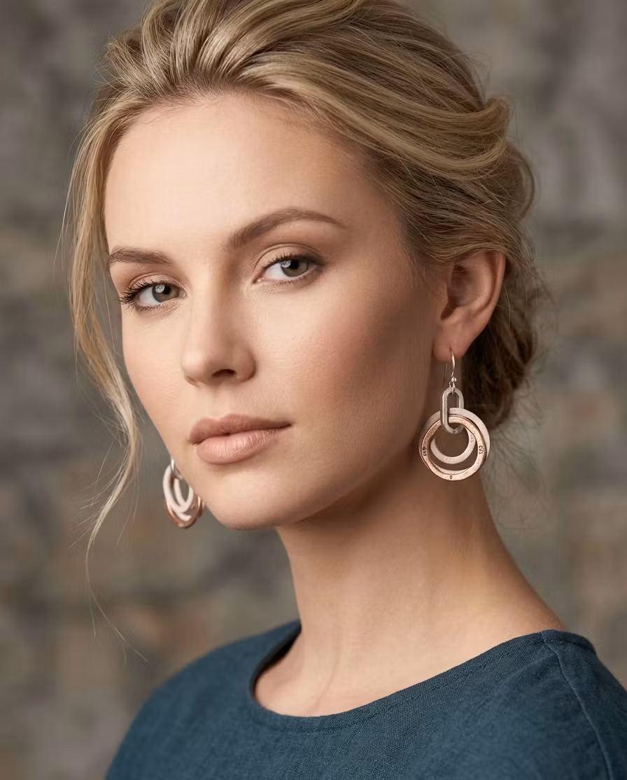 Upptäck skönheten i det ofullkomliga med våra unika örhängen, designade för dig som älskar hantverkskänsla. Varje örhänge består av sammanflätade cirklar med en rustik, hamrad yta som fångar ljuset på ett vackert sätt. Den subtila kombinationen av mjuka färger och metalliska toner ger en tidlös elegans som aldrig går ur tiden.