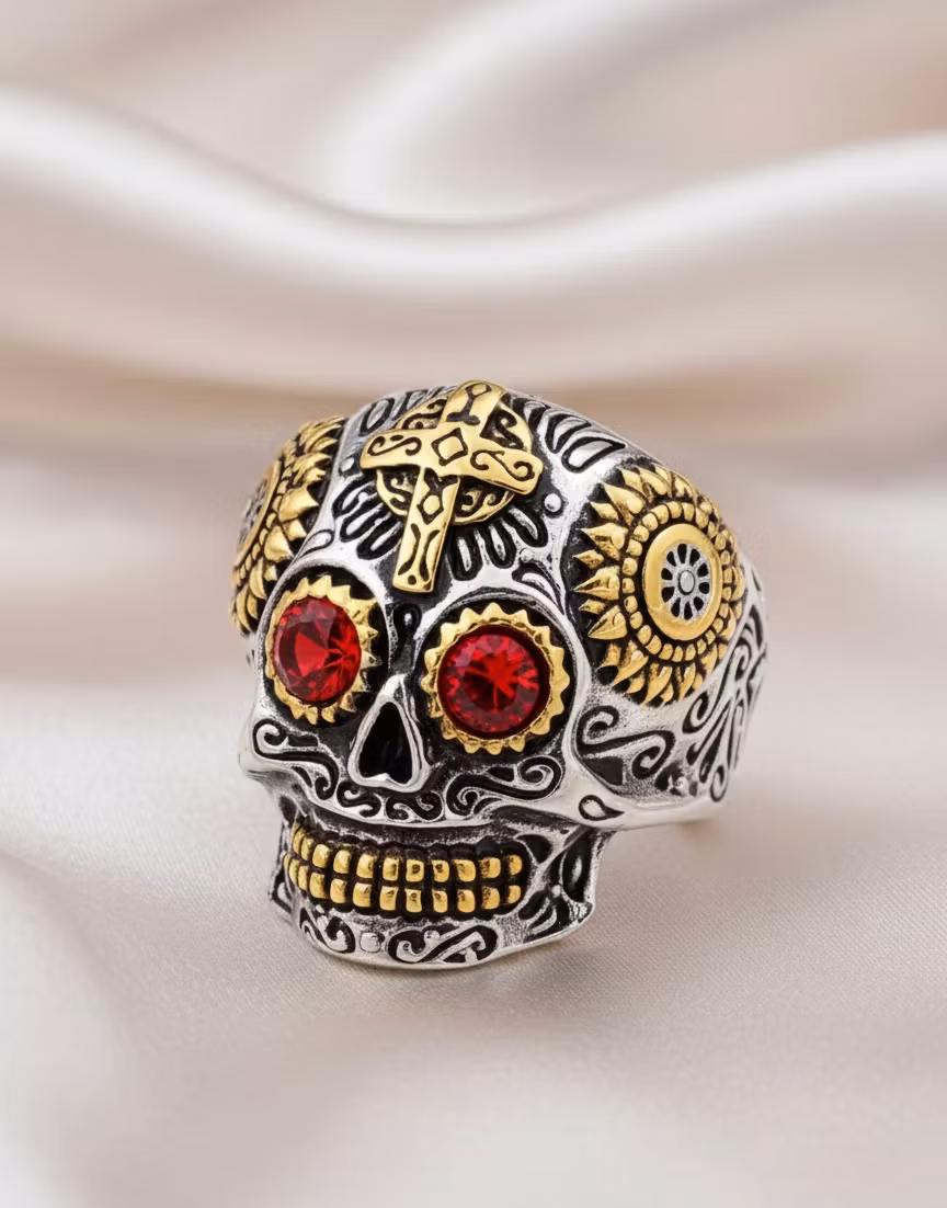 Upptäck den perfekta balansen mellan edgy design och lekfull elegans. Denna fantastiska ring är inspirerad av de traditionella mexikanska "Sugar Skulls" och är fylld med vackra detaljer som drar blicken till sig. Med sina gnistrande röda stenar som ögon, gyllene detaljer på tänderna och pannan, samt ett fint kors, är detta ett smycke som verkligen berättar en historia.