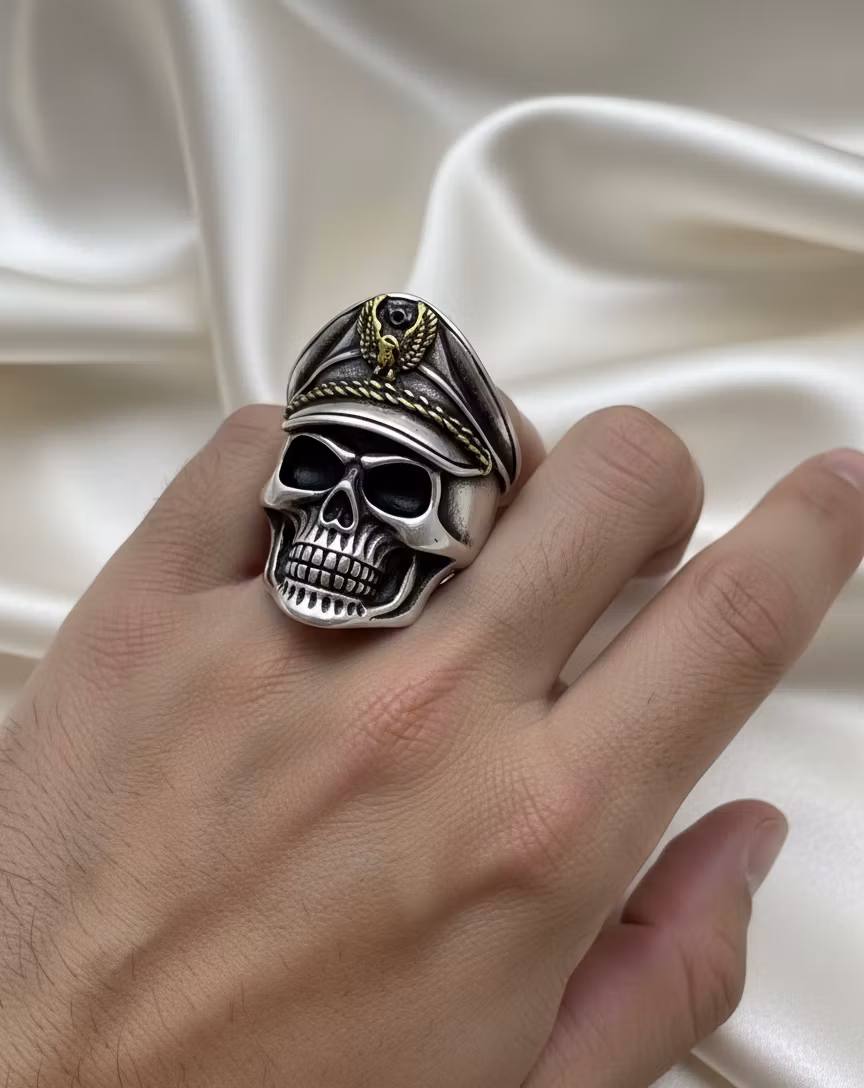 Den här ringen är skapad för dig som inte är rädd för att synas. Designen föreställer en detaljrik dödskalle iklädd en klassisk kaptensmössa, prydd med eleganta guldiga accenter som skapar en lyxig kontrast mot den rustika finishen. Det är den ultimata accessoaren som kombinerar rå attityd med en lekfull känsla.