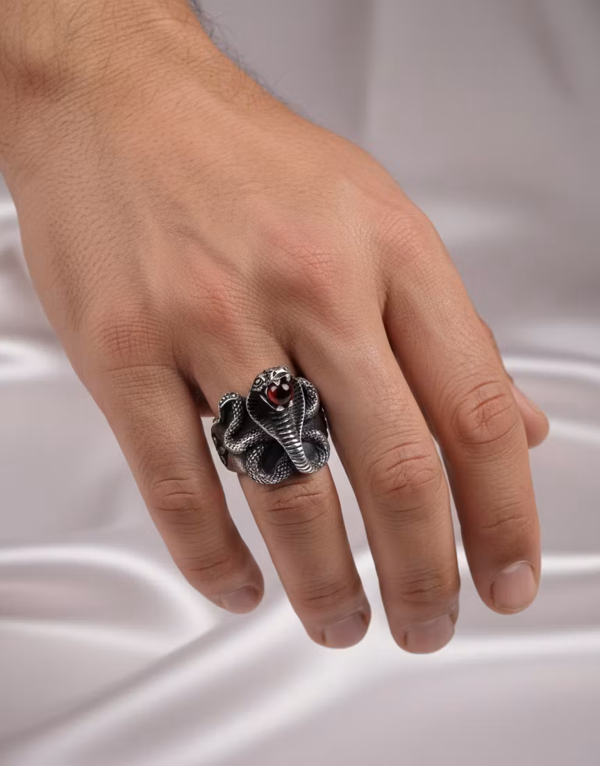 Ge din stil en kraftfull och mystisk touch med denna fantastiska kobring. Ringen är omsorgsfullt designad med fokus på detaljer, från de fina fjällen på ormens kropp till den resta huvan som ger ett majestätiskt intryck. I kobraens gap vilar en intensivt röd sten som skapar en iögonfallande kontrast mot det mörka stålet.