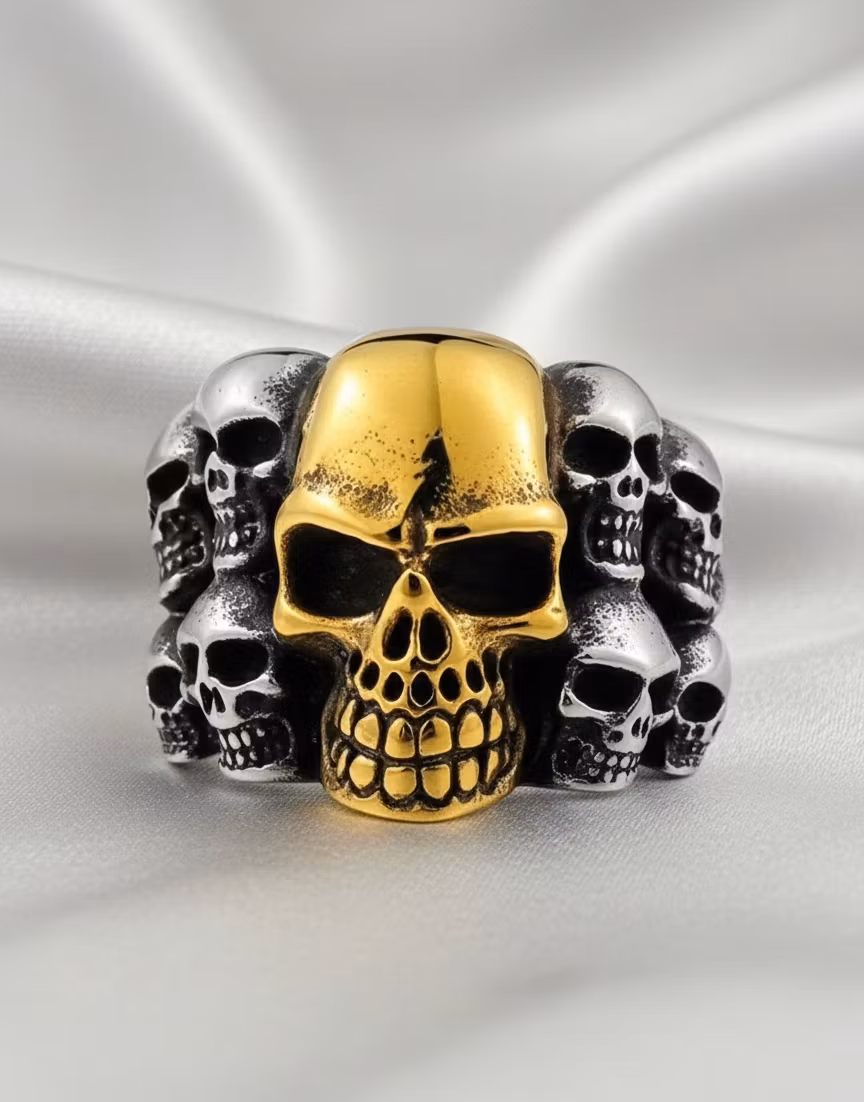 Den här ringen är skapad för den som vågar sticka ut. Med en central, guldfärgad dödskalle som omges av flera mindre, silvriga dödskallar får du en spännande kontrast som fångar allas blickar. Trots sitt tuffa motiv har ringen en glans och finish som gör att den känns både lyxig och modern.