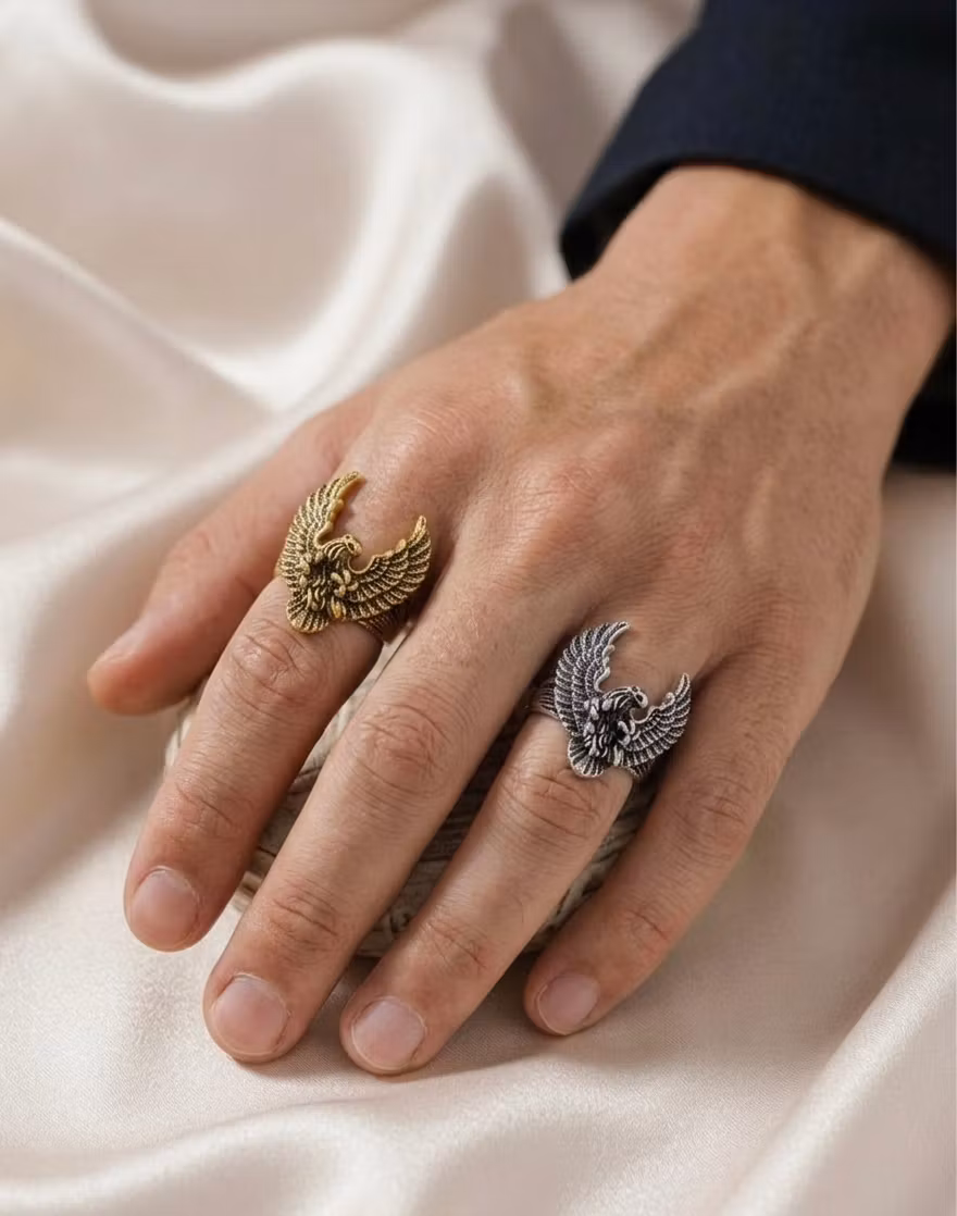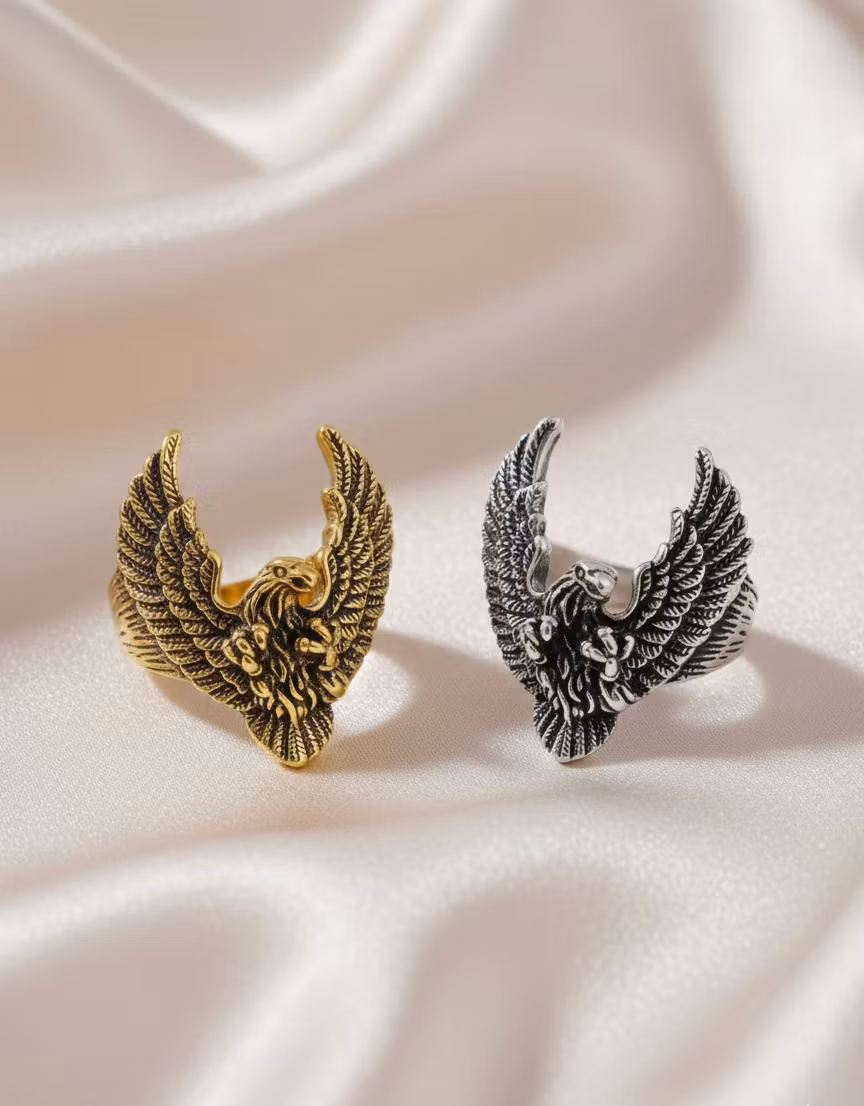 Väck din inre styrka med Eagle Spirit Ring Denna detaljrika ring är inspirerad av örnens majestätiska utstrålning och frihet. Med sina vackert utformade vingar som omsluter fingret, blir den ett blickfång som garanterat väcker uppmärksamhet. Designen kombinerar en rå, vintage-känsla med moderna detaljer, vilket gör att den känns både tuff och elegant på samma gång.