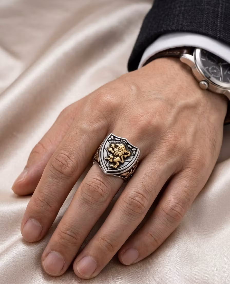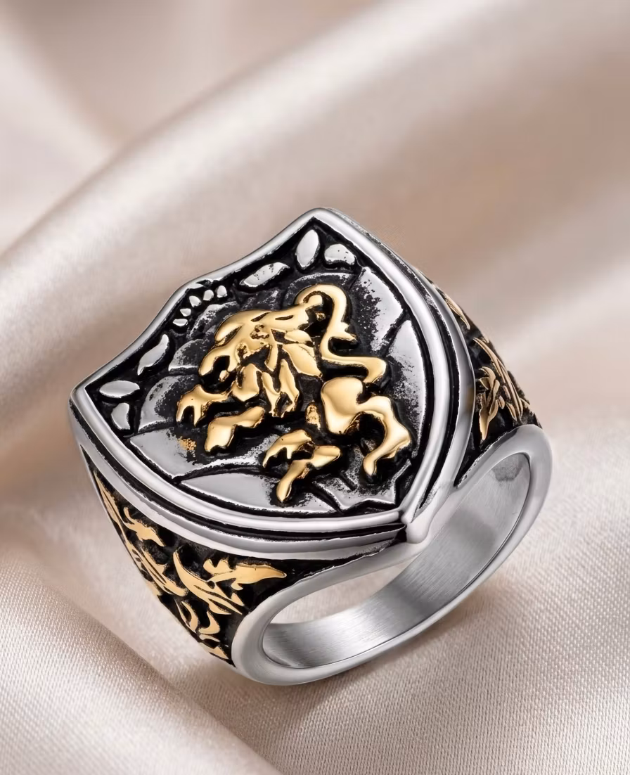 Upptäck kraften i Lejonhjärta Sköldring – en unik accessoar som kombinerar historisk estetik med modern design. Denna detaljrika ring pryds av ett gyllene lejon som vilar på en klassisk sköld, omgiven av eleganta mönster på sidorna.