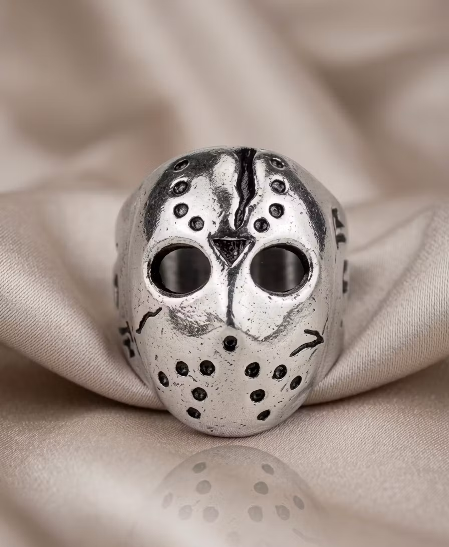 Ge din stil en unik edge med denna detaljrika ring inspirerad av den klassiska hockeymasken. Trots sitt ursprung från skräckfilmens värld har ringen en stilren och modern design som passar perfekt till vardagsstilen. Masken är konstfullt utformad med karaktäristiska detaljer, sprickor och lufthål som ger den en autentisk och lite "vintage" känsla.