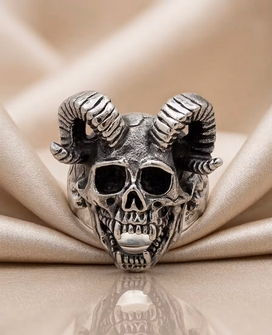 Ge din stil en unik karaktär med vår detaljrika skallring. Denna ring är designad med fantastiska detaljer, från de snirkliga hornen till det uttrycksfulla ansiktet, vilket skapar en perfekt balans mellan mystik och lekfullhet.