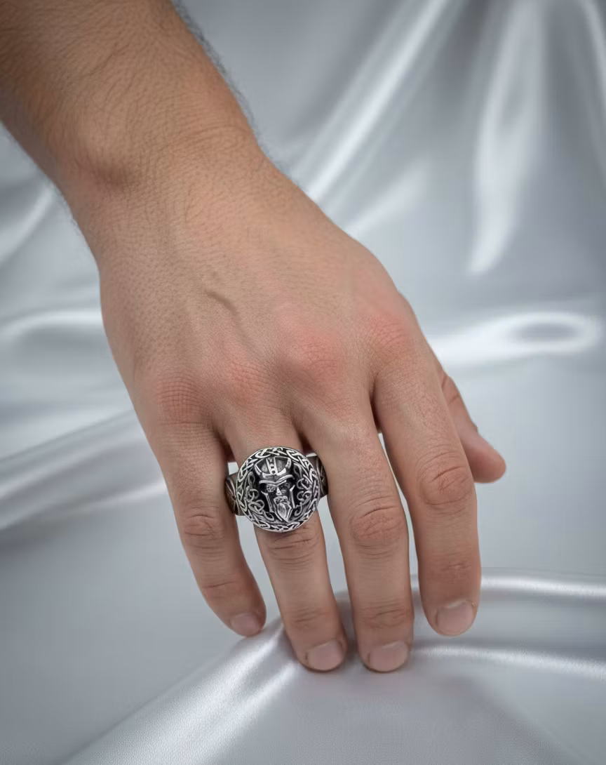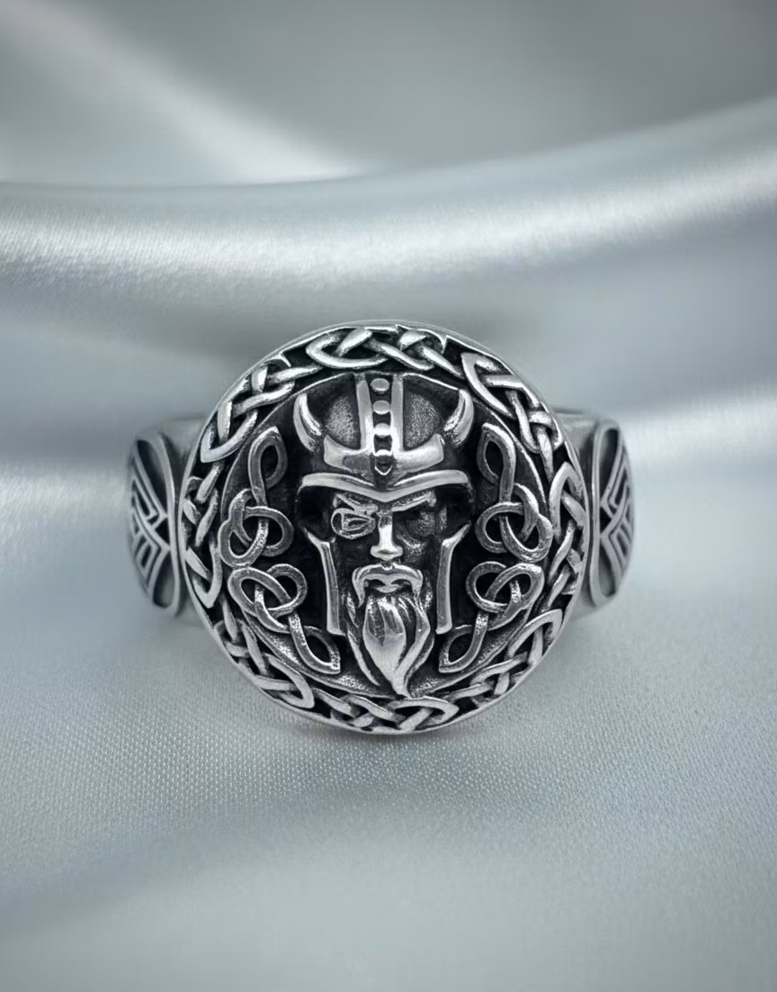 Denna detaljrika ring är inspirerad av den mäktiga nordiska mytologin. I centrum syns den visdomssökande guden Oden, omgiven av vackra och invecklade keltiska knutar som symboliserar evighet och styrka. Ringen har en rustik "vintage look" med mörka kontraster som verkligen får de fina detaljerna att poppa.