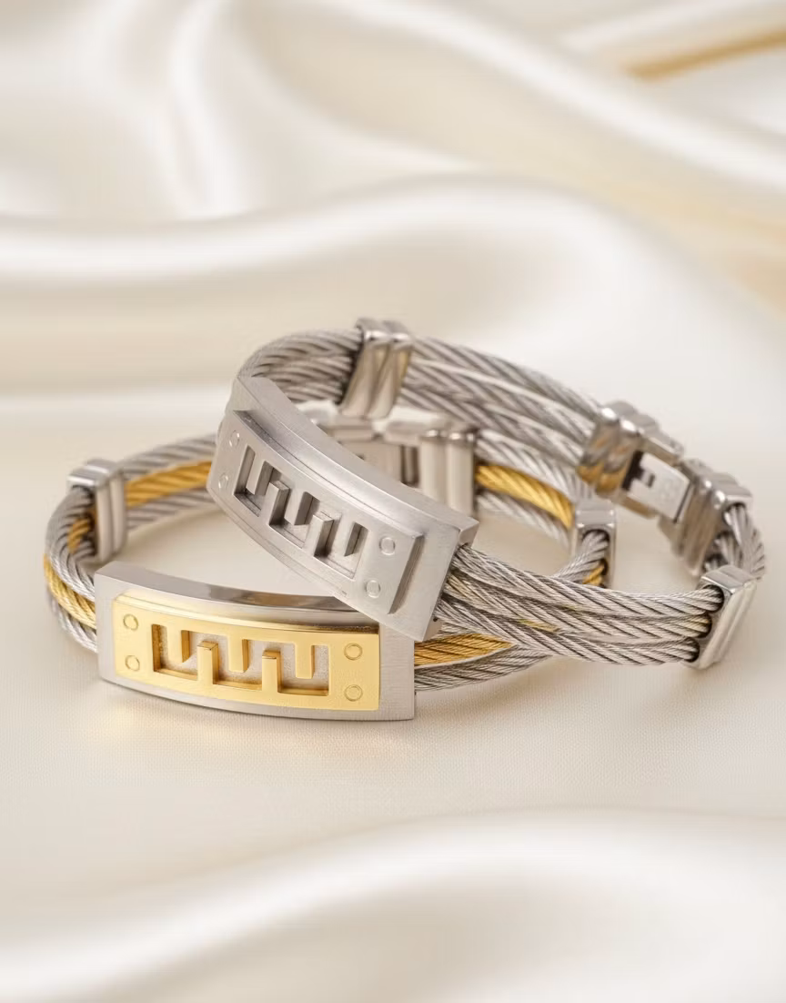 Upplev den perfekta balansen mellan industriell design och klassisk elegans. Detta unika armband är tillverkat av högkvalitativt rostfritt stål (stainless steel), vilket gör det både hållbart och skonsamt mot huden. Designen har en vacker flätad kabelstruktur som ger en lyxig och robust känsla, prydd med en stilren detalj i mitten som drar blicken till sig.