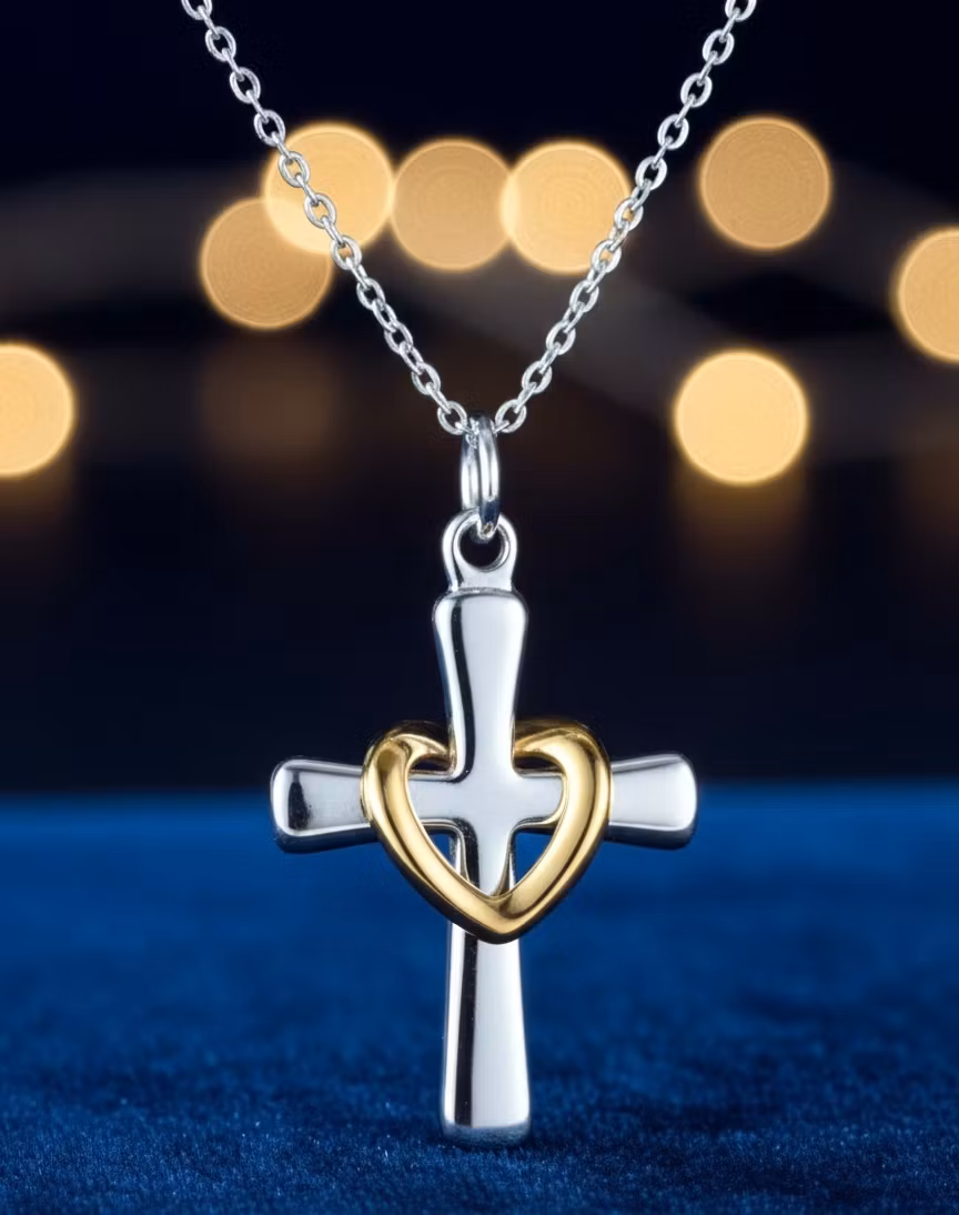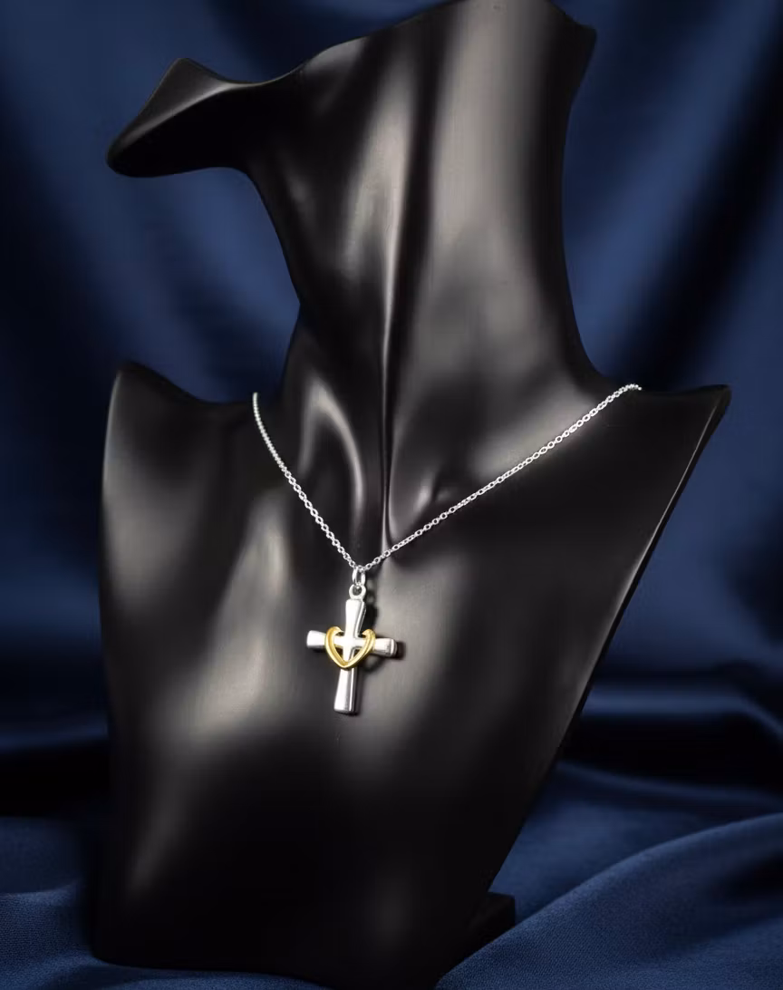 Låt din stil stråla med detta vackra hängsmycke där det klassiska korset möter kärlekens symbol – hjärtat. Smycket är skapat med en sofistikerad tvåtonskombination i silver och guld, vilket ger en modern och lyxig känsla som passar till alla tillfällen.