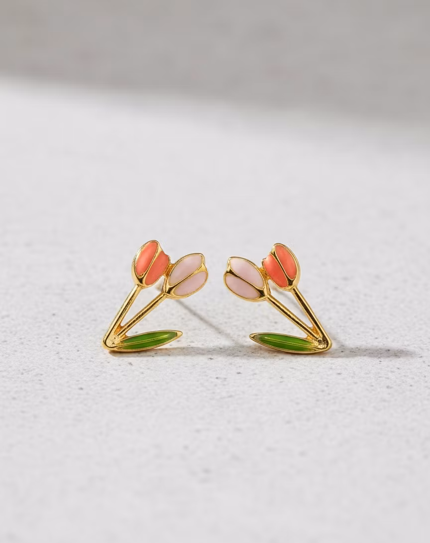 Låt stilen blomstra med våra charmiga tulpanörhängen. Dessa smycken är skapade med omsorg och har en unik design med två sammanflätade tulpaner i en härlig kombination av korallrosa och ljusrosa emalj. De guldpläterade detaljerna ger en lyxig inramning och de gröna bladen vid basen skapar en vacker kontrast som verkligen fångar ögat.