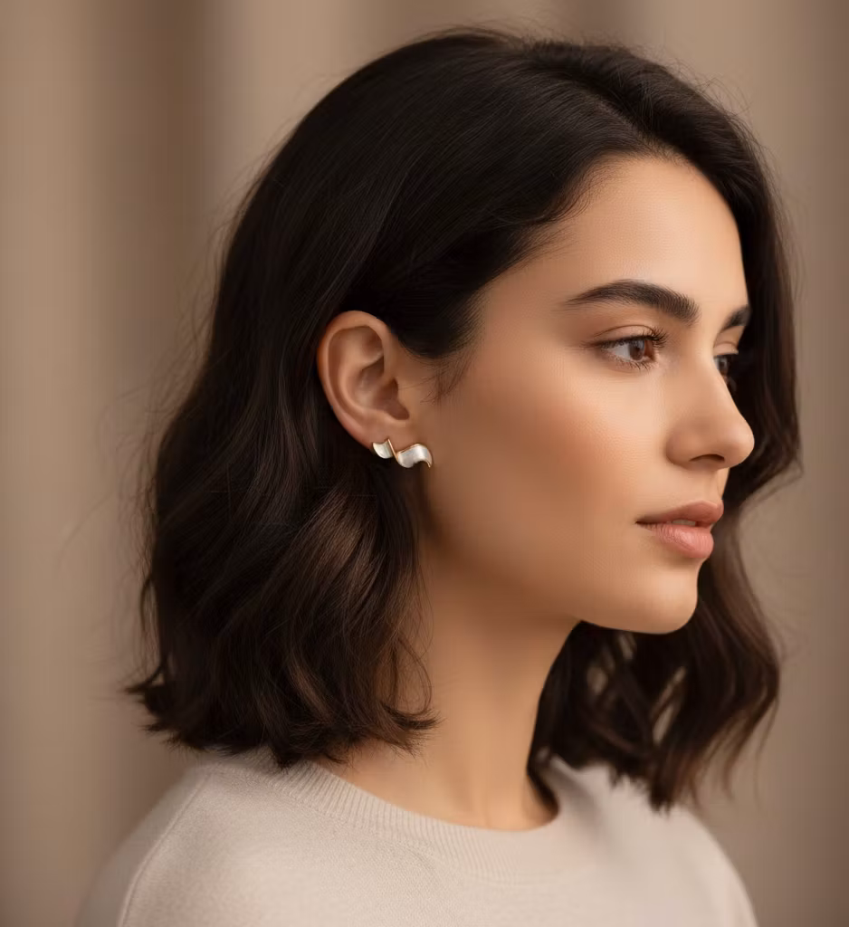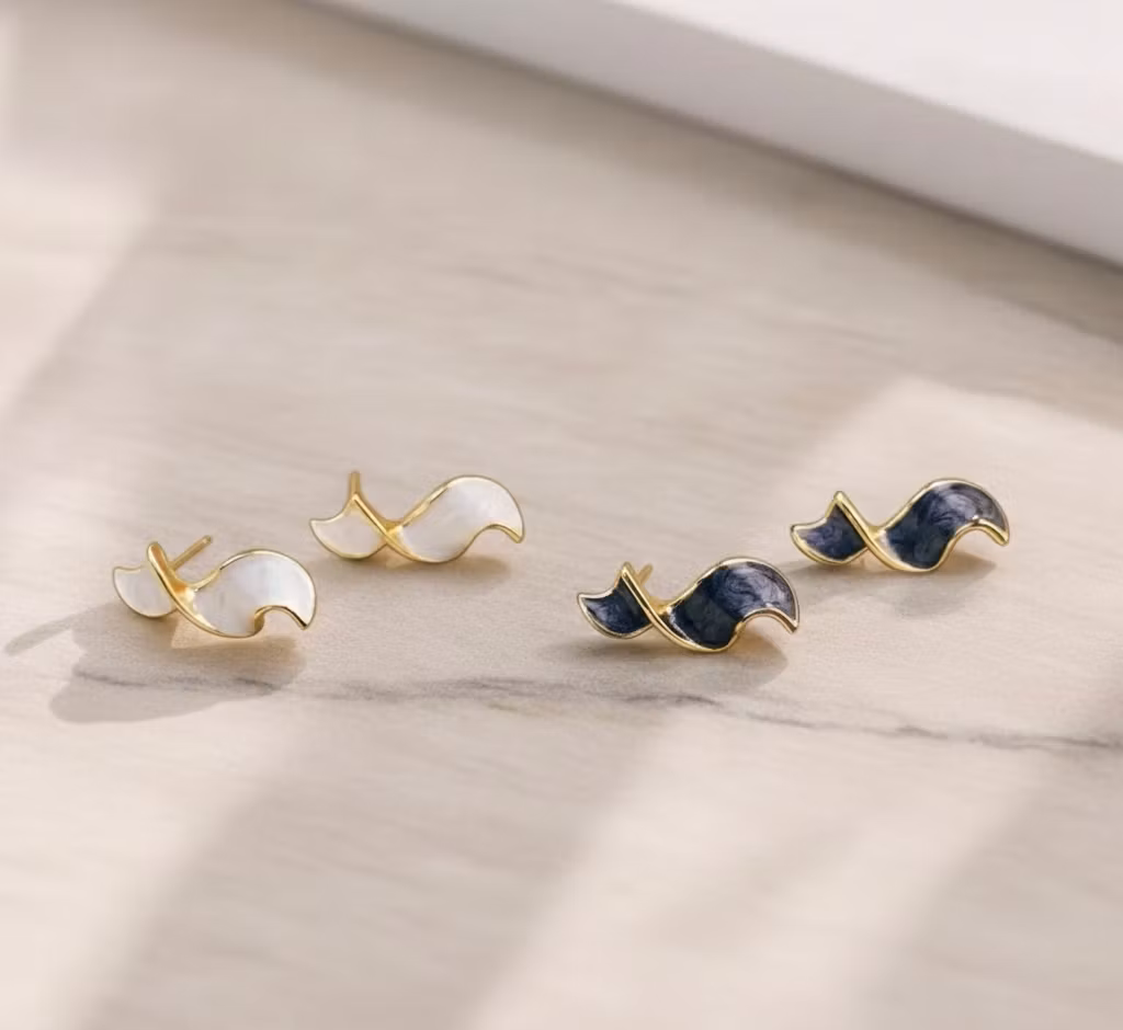 Upptäck skönheten i det enkla med våra handplockade örhängen med en böljande silhuett. Dessa örhängen är designade med en elegant, skruvad form som påminner om mjuka vågor, vilket ger en dynamisk och levande känsla när de bärs.