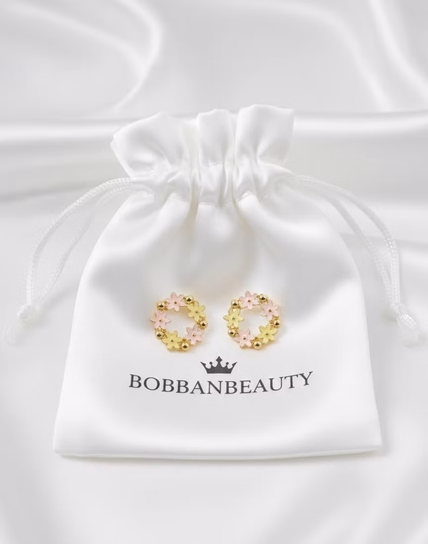 Ge din smycke samling en romantisk uppgradering med våra charmiga blomörhängen. Dessa örhängen är designade som en liten krans, prydd med detaljrika blommor i mjuka nyanser av pastellrosa och ljusgult, varvat med små guldglänsande detaljer.