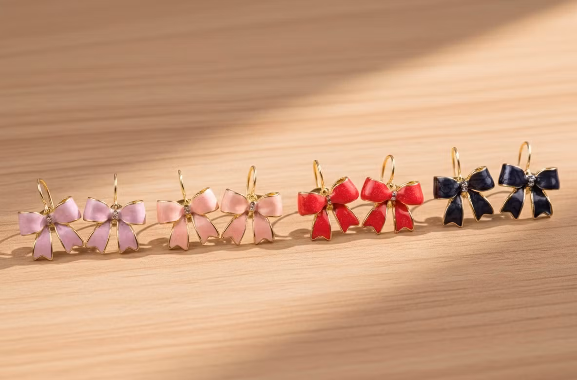 Låt dig förtrollas av våra vackra rosettörhängen, designade för att sprida glädje och stil i vardagen. Varje par är omsorgsfullt tillverkat med en högkvalitativ emaljfinish som ger en mjuk och lyxig glans. I mitten av varje rosett sitter en gnistrande liten sten som fångar ljuset vid varje rörelse du gör.