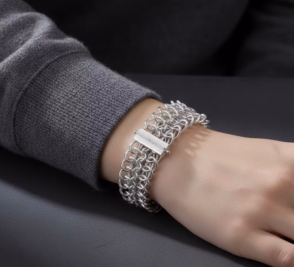 Detta vackra hantverk är tillverkat i silverpläterad och har en unik, fyllig struktur som ger en lyxig känsla på handleden. Armbandet består av tätt sammanvävda ringar som skapar ett fantastiskt ljusspel och en mjuk, följsam passform.