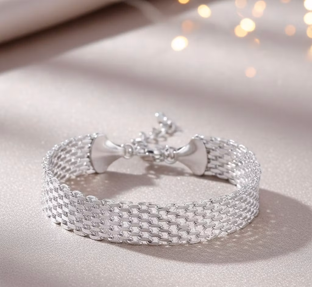 Upptäck skönheten i vårt eleganta mesh-armband, designat för att sitta mjukt och behagligt runt handleden. Armbandet har en vacker, vävd struktur som fångar ljuset från alla vinklar och ger en lyxig, silkeslen glans.