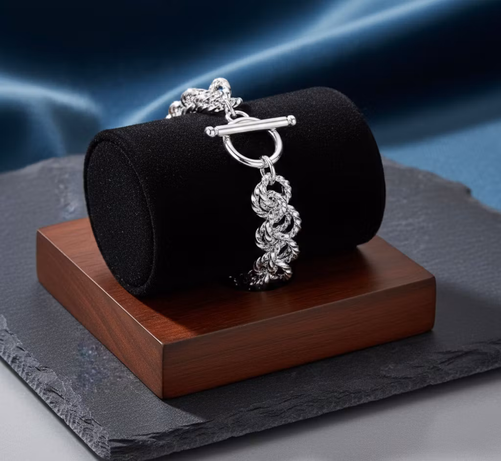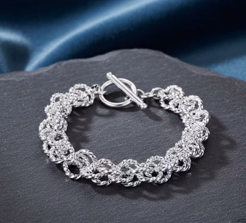 Låt din stil stråla med detta fantastiska armband som kombinerar klassiskt hantverk med modern elegans. Armbandet består av intrikat flätade länkar med en texturerad yta som fångar ljuset på ett förtrollande sätt, vilket skapar en glittrande effekt vid varje rörelse.