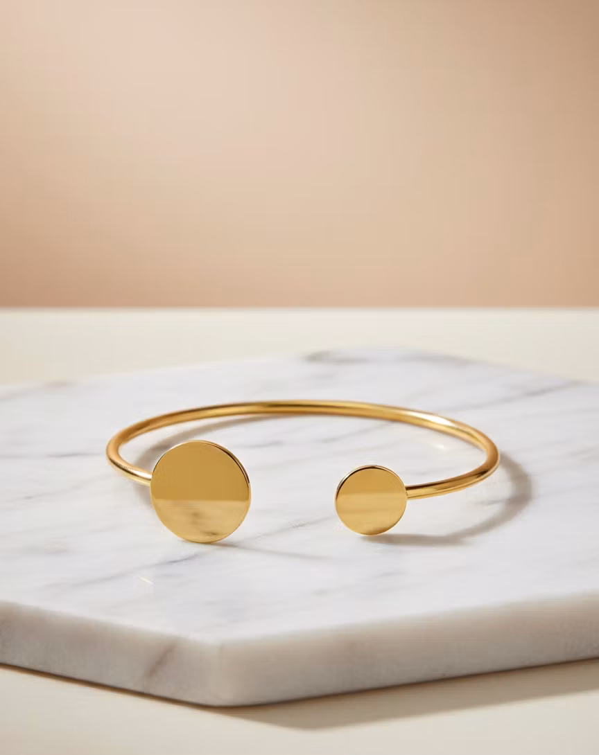 Minimalistisk design möter klassisk lyx. Upptäck skönheten i det enkla med vår eleganta öppna armring. Denna stilrena smyckesdetalj är omsorgsfullt utformad i en blank guldfinish som fångar ljuset vackert vid varje rörelse. Designen pryds av två polerade cirklar i olika storlekar, vilket skapar en harmonisk och modern asymmetri.