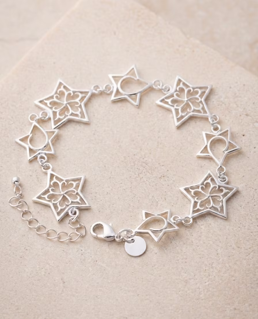 Detta eleganta armband är designat för dig som älskar detaljer med betydelse. Smycket består av en rad sammankopplade stjärnor, där hälften pryds av ett intrikat och romantiskt utskuret mönster, medan de andra har en stilren och modern silhuett. Denna unika kombination skapar en spännande dynamik och en feminin känsla.