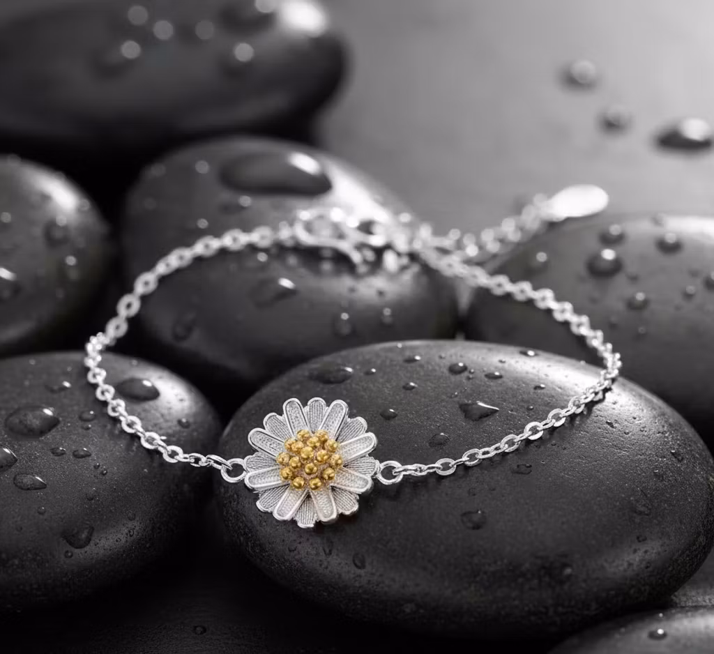 Kontrasten mellan det kalla silvret och den gyllene kärnan ger blomman ett levande uttryck som påminner om en solig dag på ängen. Det är den perfekta presenten till någon du tycker om, eller som en fin gåva till dig själv för att fira vardagens små stunder. Armbandet är justerbart för att passa perfekt på handleden och är lika fint att bära ensamt som att kombinera med andra smycken.