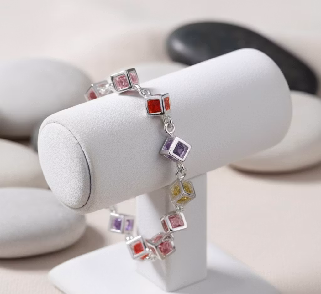 Låt din handled glänsa med vårt eleganta och färgglada armband. Smycket är designat med en serie små, noggrant utformade kuber som innesluter gnistrande kristaller i regnbågens alla färger – från djupt rött och kungligt lila till soligt gult och mjukt rosa.