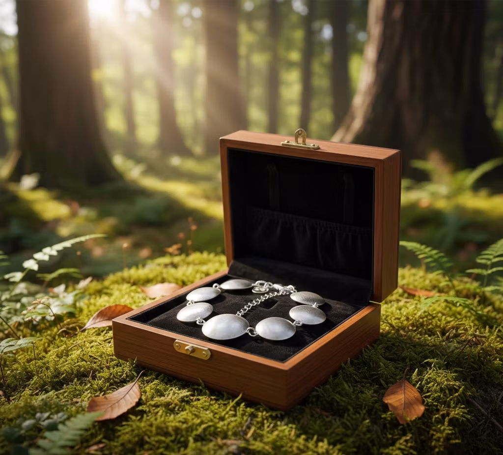 Detta vackra smycke är inspirerat av naturens egna former. Armbandet består av sju noggrant utformade, cirkulära diskar med en sofistikerad borstad finish som ger en mjuk och matt lyster. Designen för tankarna till havsslipade stenar som varsamt formats av vågorna under decennier.